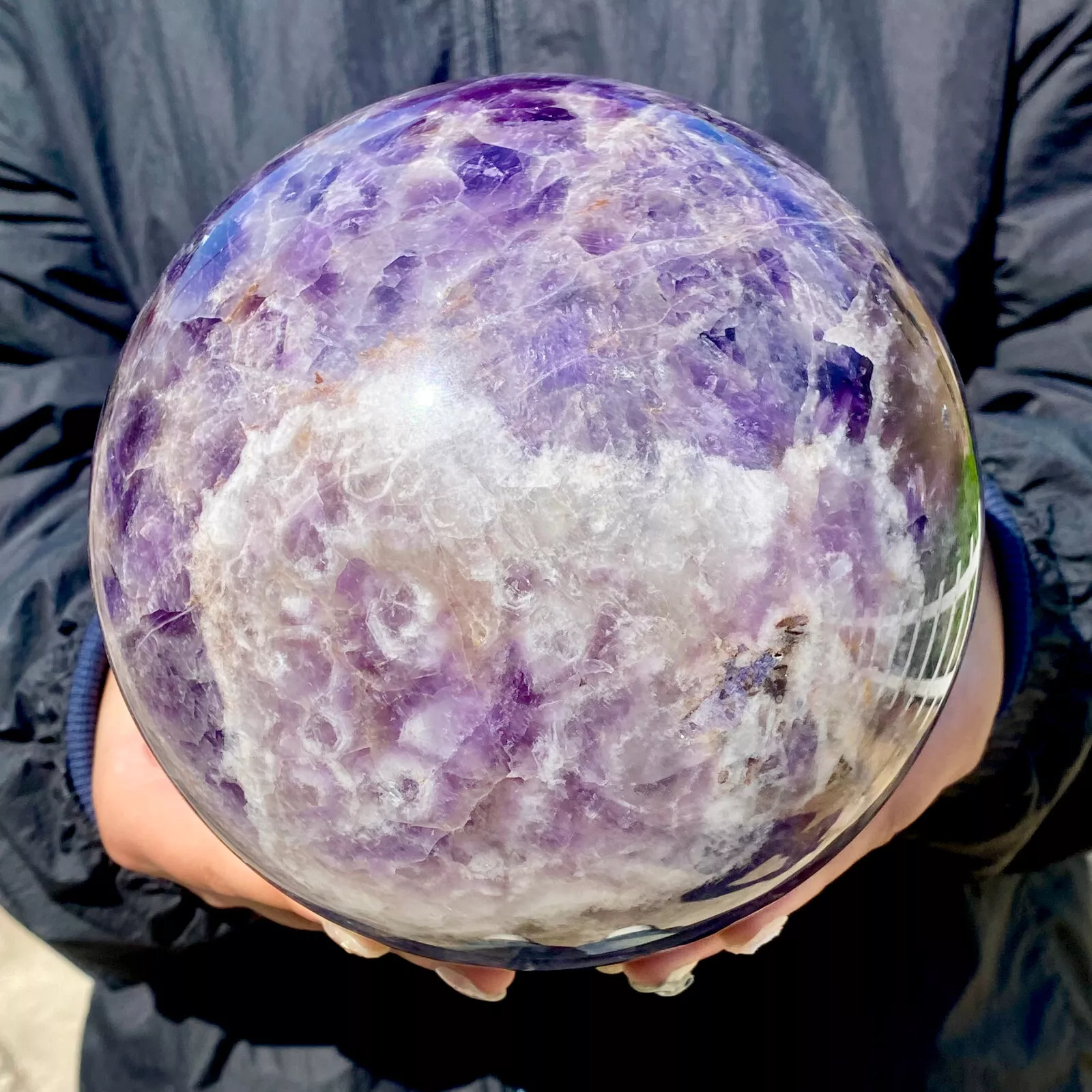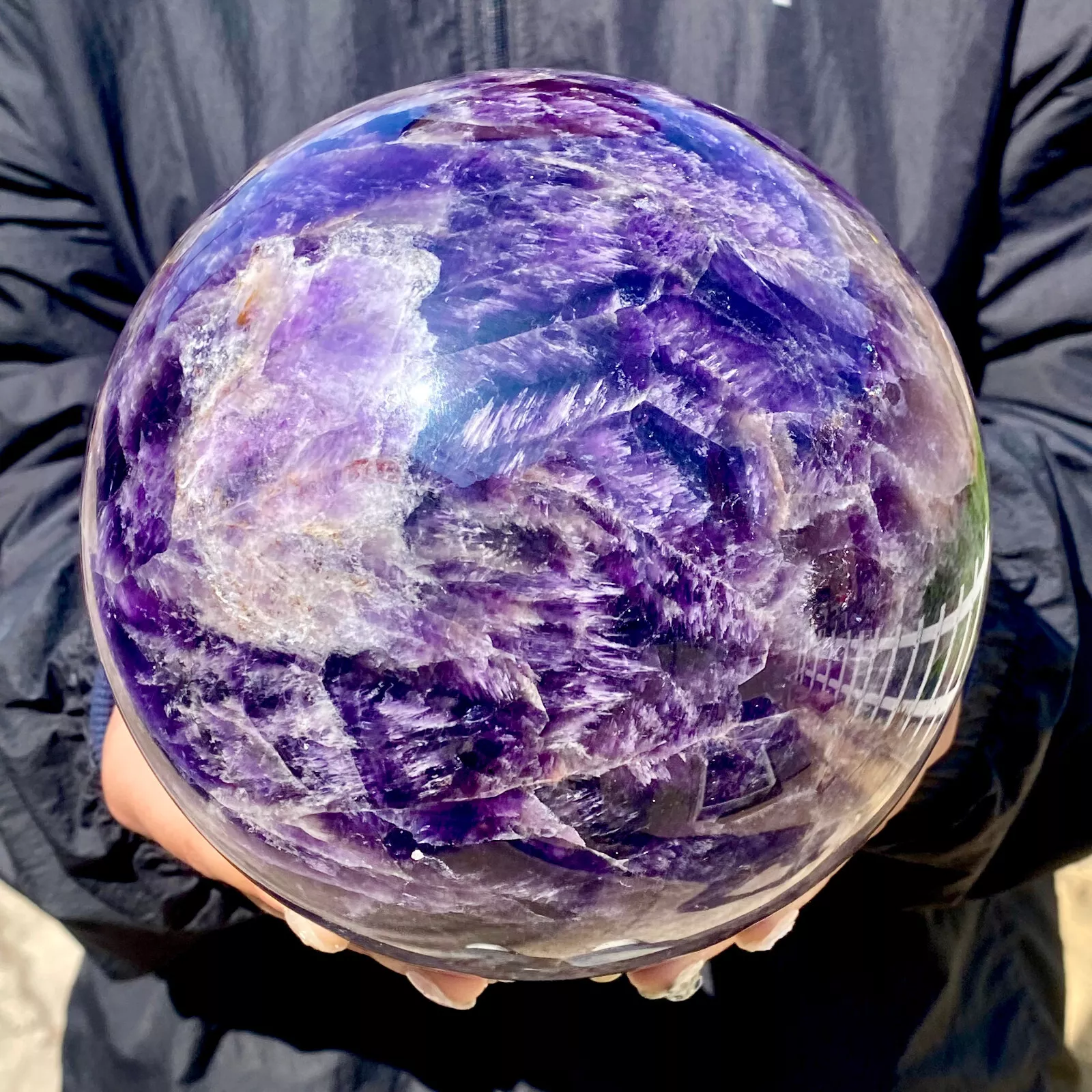 Predstavljamo vam vrhunsko naravno ametistno sfero iz kakovostnega kvarca, težko 5.22 kg, ki združuje izjemno vizualno privlačnost z globoko energetsko močjo. Gre za izjemno čist, t.i. dreamy ametist z značilno globoko vijolično barvo in nežnimi prehodi, ki so posledica naravnih variacij železovih vključkov. Kristal je ročno oblikovan v popolno kroglo, kar simbolizira enakomeren tok energije v vse smeri – ključno lastnost za uporabo v reiki terapiji, meditaciji in energetskih mrežah.